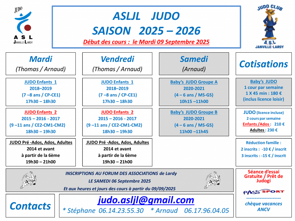 Président : Arnaud COPIN Secrétaire : Julien COPIN Trésorier : Stéphane LEMONNIER Thomas JAFFART Contact : judo.asljl@gmail.com Judo de 4 à …. ansCours Baby’s 4-6 ansEnfants 6-12 ansAdos / Adultes 13-….. ans Dojo du Gymnase René Grenault à Lardy Bourg